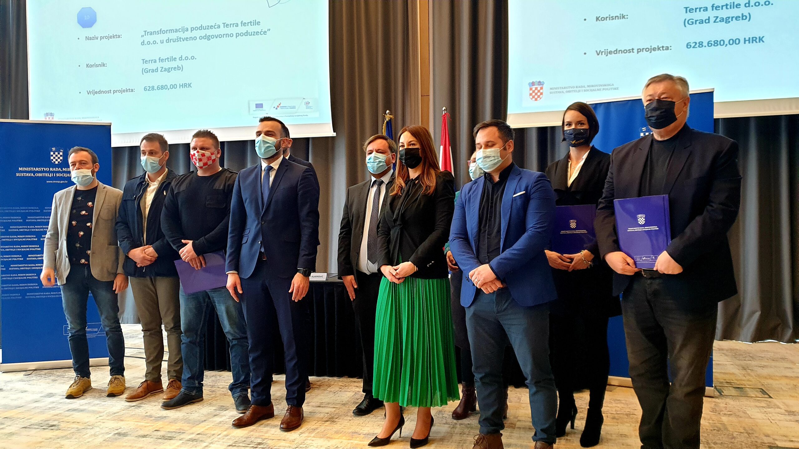 Ministar rada, mirovinskoga sustava, obitelji i socijalne politike Josip Aladrović i zamjenik ravnateljice Nacionalne zaklade za razvoj civilnoga društva Luka Bogdan svečano su uručili 15 ugovora u ukupnoj vrijednosti gotovo 16 milijuna kuna za projekte kojima je cilj ojačati kapacitete postojećih i novih društvenih poduzeća i poduzetnika.